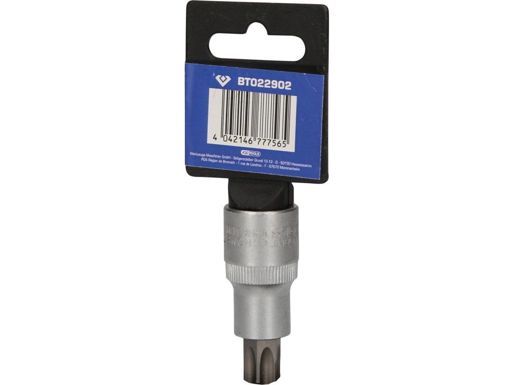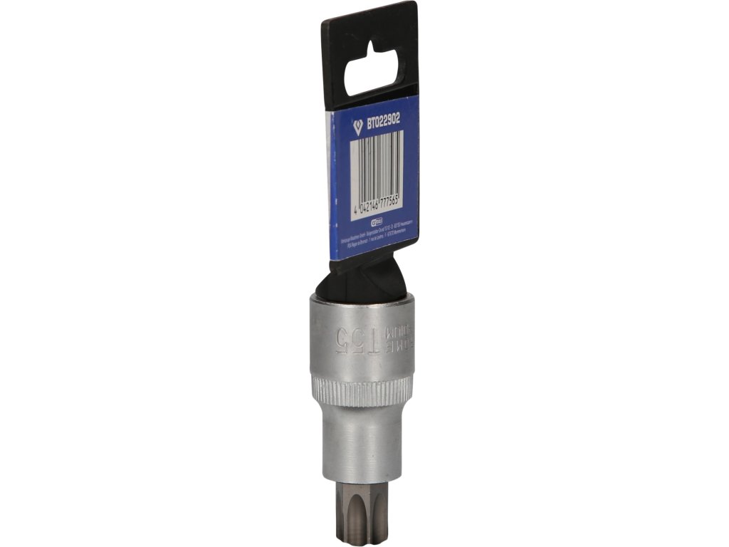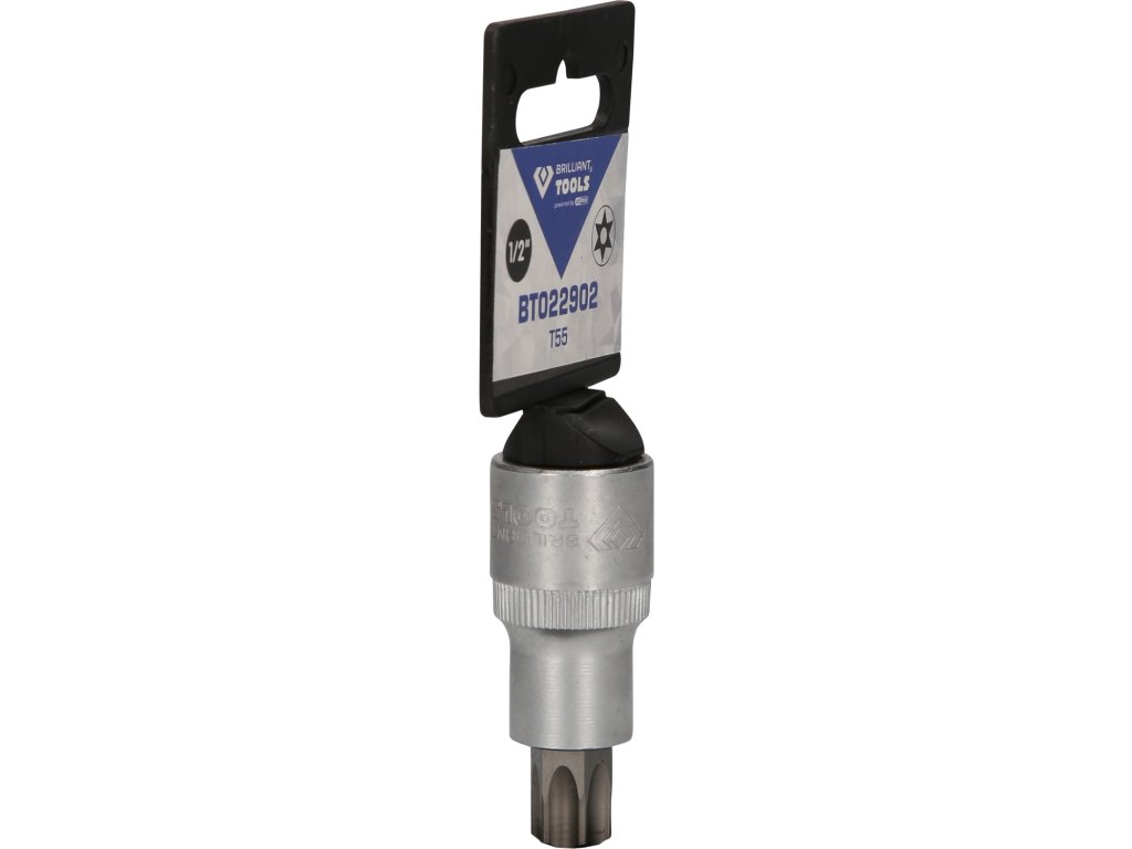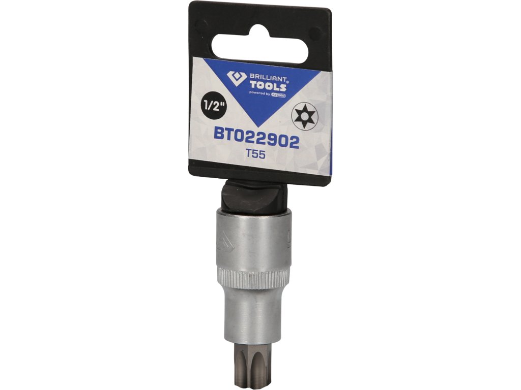 BRILLIANT TOOLS nástrčný bit Torx s čelným otvorom BT022902 má 1/2" (12,5 mm) pohon s vnútorným štvorhranom, ktorý je vyrobený podľa normy DIN 3120. Veľkosť zalisovaného fosfátovaného bitu je TB55 s otvorom na čelnej strane. Celková dĺžka nástrčného bitu je 55 mm, dĺžka hrotu je 17 mm. Povrch je na strane pohonu a na strane bitu matne pochromovaný, tento je oddelený pozdĺžnym ryhovaním.