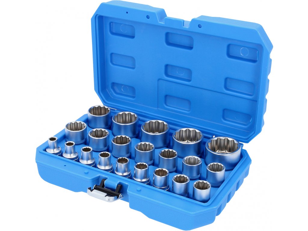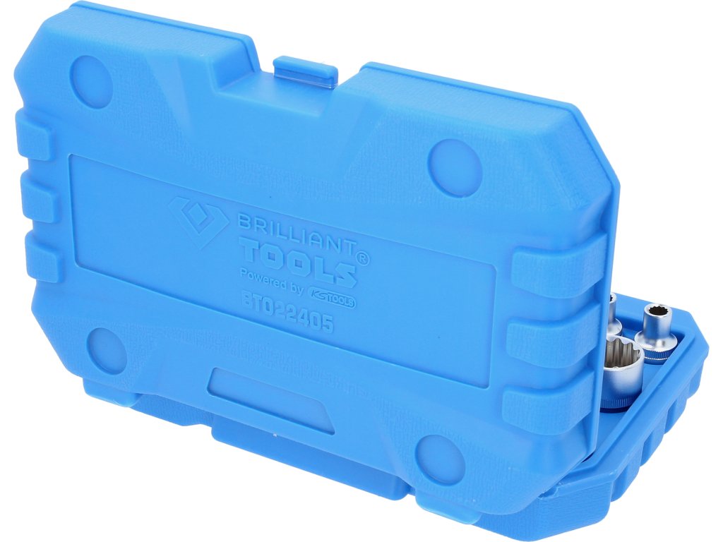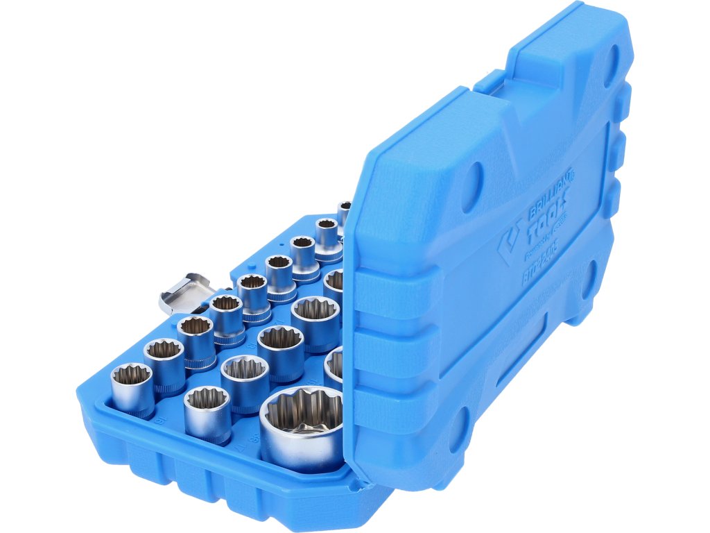 21-dielna súprava nástrčkových kľúčov BRILLIANT TOOLS BT022405 je vyrobená podľa normy DIN. Celá súprava má 1/2" (12,5 mm) pohon s vnútorným štvorhranom. Dodáva sa v praktickom kufri s kovovými závesmi a uzávermi s upnutým náradím. Popis v kufri umožňuje rýchle nájdenie vhodných nadstavcov. Celkom 21 metrických dvanásťhranných nástrčných orechov má veľkosti od 8 mm do 36 mm s celkovou dĺžkou 38 mm.