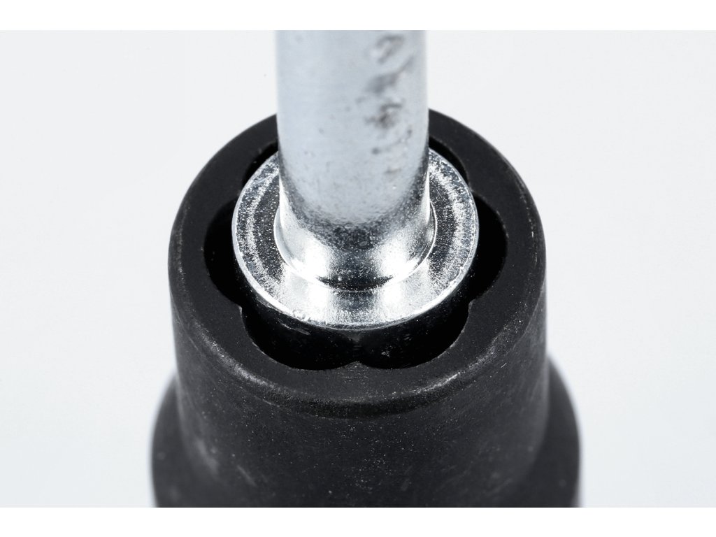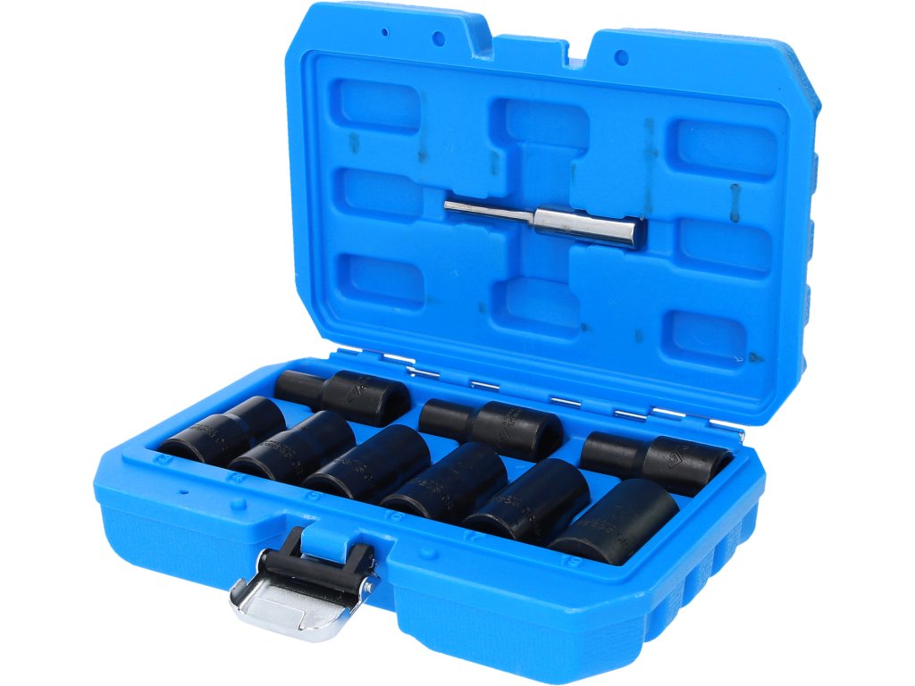 10-dielna BRILLIANT TOOLS súprava 1/2" nástrčných orechov so špirálovým profilom BT026000 je nevyhnutným pomocníkom pre poškodené hlavy matíc alebo skrutiek. 6 kužeľovitých rezných hrán sa dostane do hlavy skrutky a umožní tak uvoľnenie šesťhranu, ktorý sa inak nedá uviesť do chodu. 1/2" (12,5 mm) pohon s vnútorným štvorhranom je vyrobený podľa normy DIN 3120. S vyrážačom, ktorý je súčasťou súpravy, je možné matice alebo skrutky jednoducho vyraziť. Celkom 9 nástrčných orechov so špirálovým profilom má veľkosti od 10 mm do 19 mm s celkovou dĺžkou 34 mm. Povrch je fosfátovaný a ponúka najvyššiu úroveň ochrany proti korózii.
