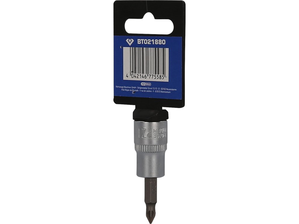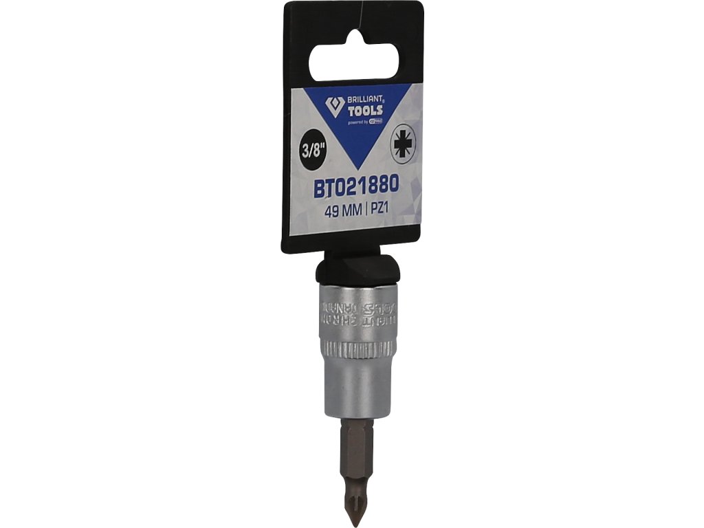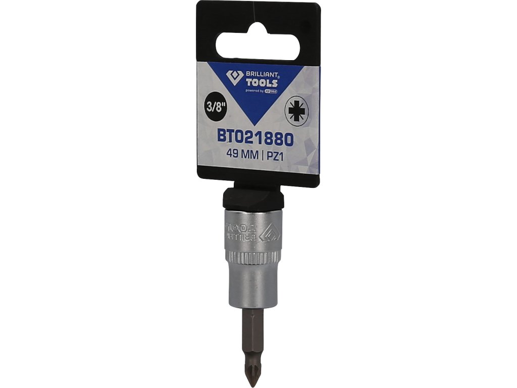 BRILLIANT TOOLS PZ nástrčný bit krížový BT021880 má 3/8" (10 mm) pohon s vnútorným štvorhranom, ktorý je vyrobený podľa normy DIN 3120. Veľkosť zalisovaného fosfátovaného bitu s krížovým profilom je PZ1 (Pozidriv). Celková dĺžka nástrčného bitu je 49 mm, dĺžka čepele je 17 mm. Povrch je na strane pohonu a na strane bitu matne pochromovaný, tento je oddelený pozdĺžnym ryhovaním.
