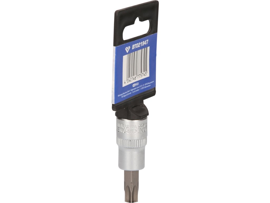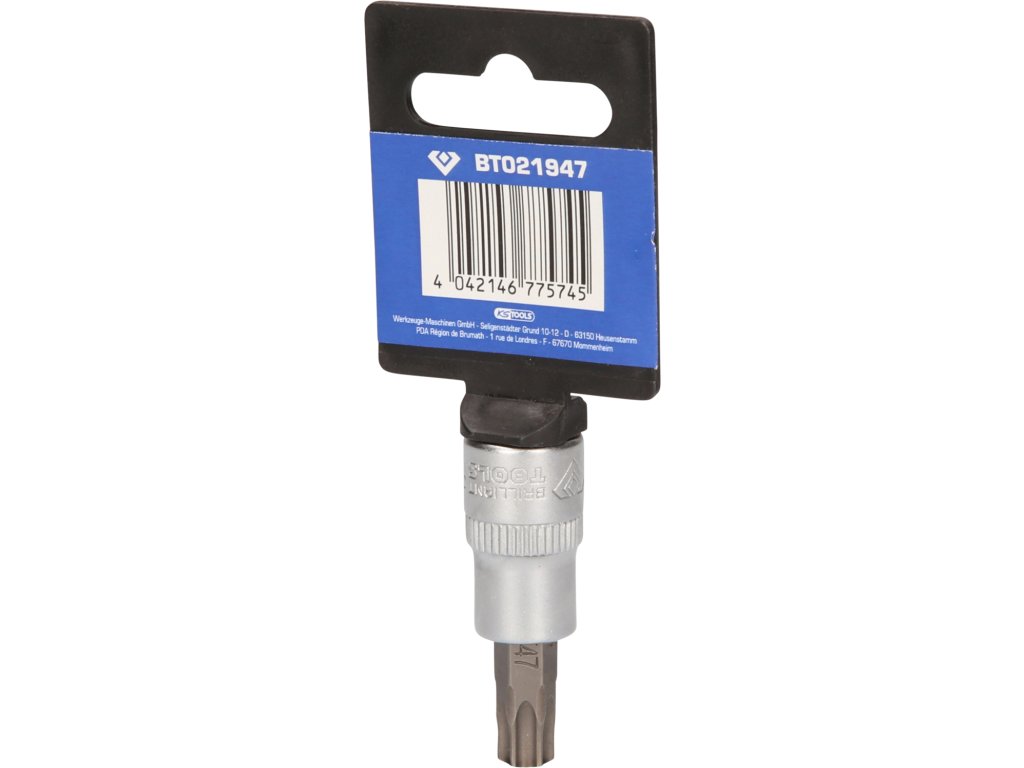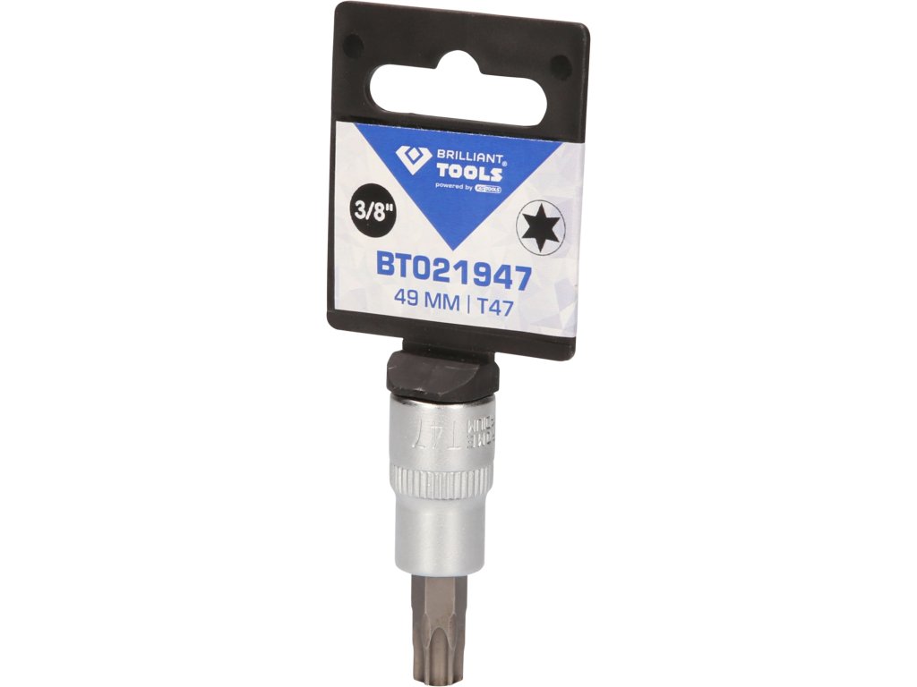 BRILLIANT TOOLS nástrčný bit Torx BT021947 má 3/8" (10 mm) pohon s vnútorným štvorhranom, ktorý je vyrobený podľa normy DIN 3120. Veľkosť zalisovaného fosfátovaného bitu je T47. Celková dĺžka nástrčného bitu je 49 mm, dĺžka čepele je 17 mm. Povrch je na strane pohonu a na strane bitu matne pochromovaný, tento je oddelený pozdĺžnym ryhovaním.