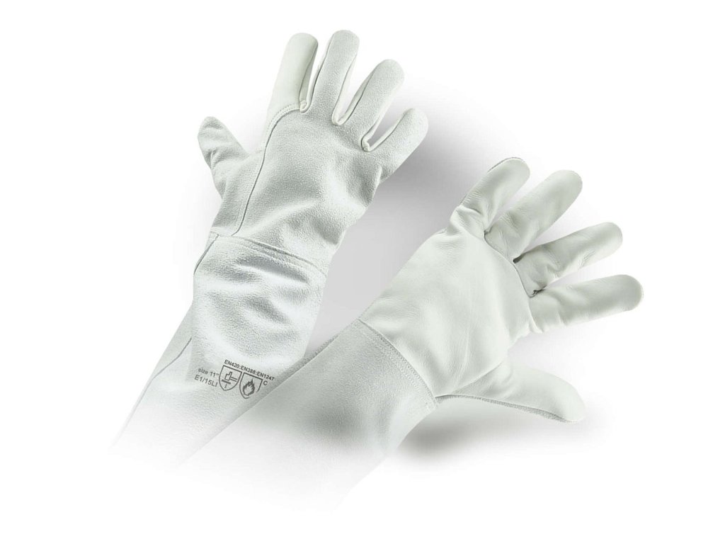 | materiálové zloženie | dlaň z triedenej jahňatiny, 20 cm dlhá tuhá manžeta zo štiepanej hovädziny, šité kevlarovou niťou |