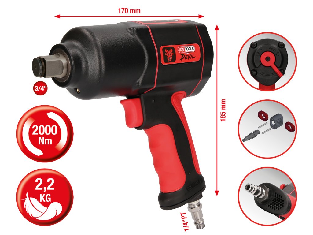 KS Tools 3/4" THE DEVIL vysokovýkonný pneumatický rázový skrutkovač, 2000 Nm