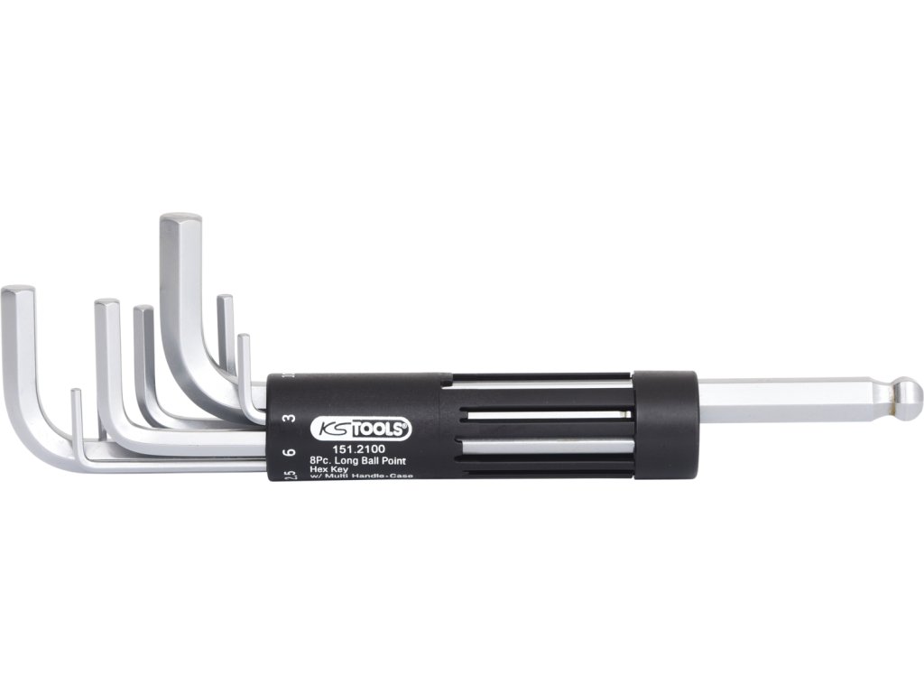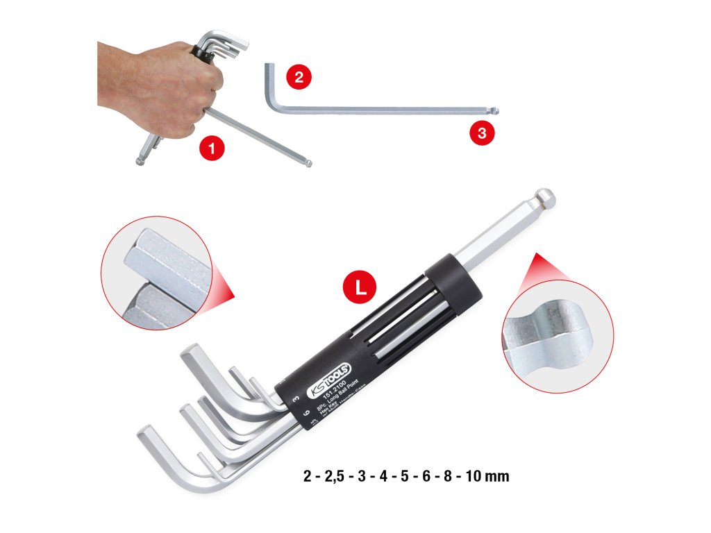 KS Tools Sada zahnutých imbusových kľúčov s guľovou hlavou 3 v 1, 8-dielna, dlhá