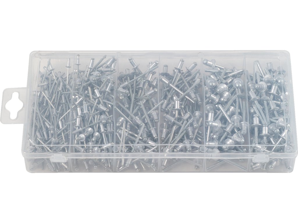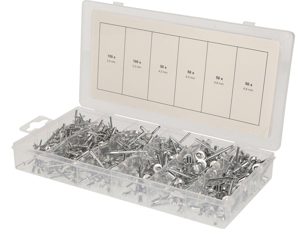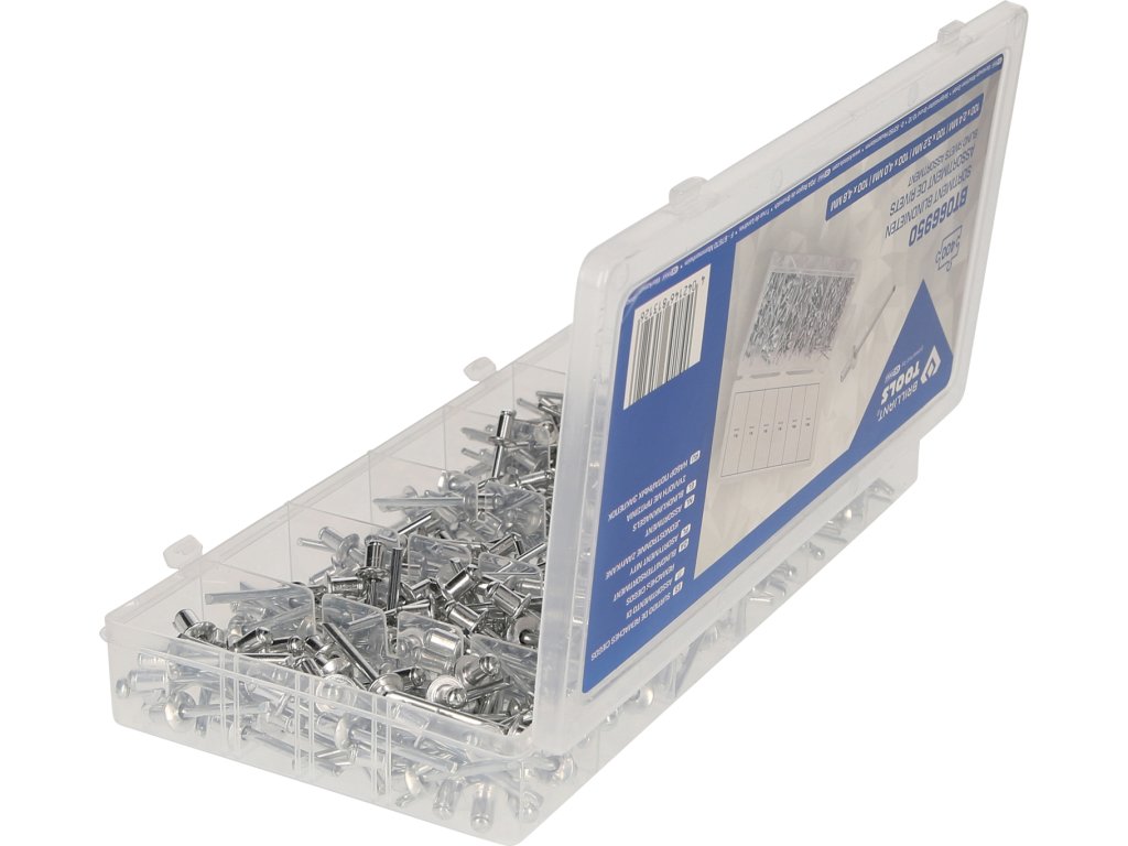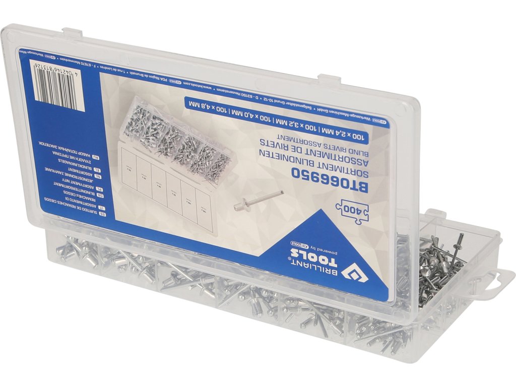 Sortiment hliníkových slepých nitov BRILLIANT TOOLS BT066950 sa dodáva v praktickom, stabilnom a opätovne použiteľnom priesvitnom boxe. Je ideálny pre automobilový priemysel a strojárstvo, ako aj pre mnohé iné aplikácie. Sortiment obsahuje veľkosti: Ø 2,4 - 3,2 - 4,0 - 4,8 po 100 kusov, vzájomne oddelené, uložené v priesvitnom boxe.
