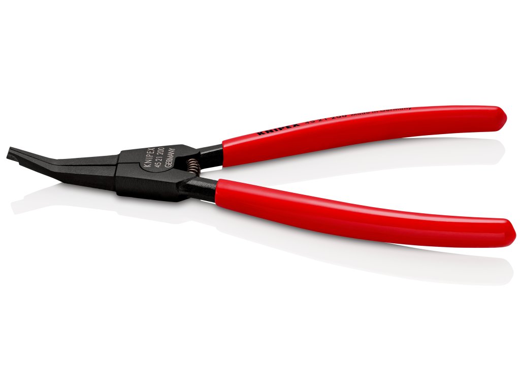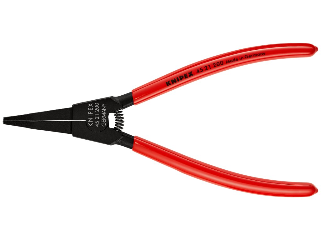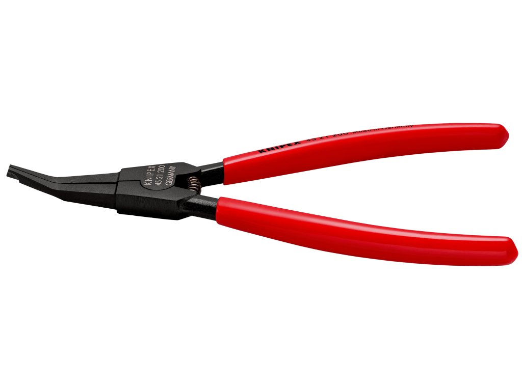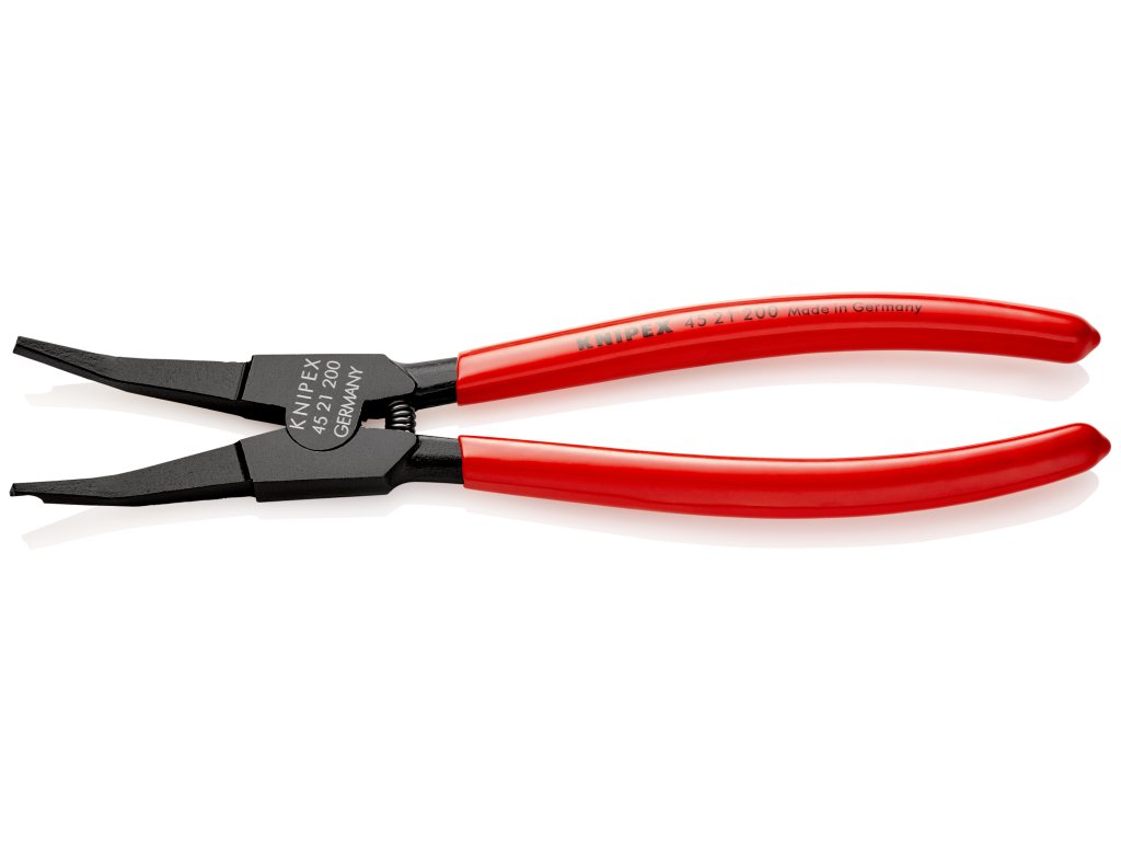 45 21 200 špeciálne montážne kliešte pre poistné krúžkyNa montáž pružinových krúžkov v tvare podkovy a poistných krúžkov bez montážnych otvorov. Pre poistky na hriadeľoch. S otváracou pružinou. uhlové čeľuste s centrovacím otvorom. pre zacvakávacie krúžky väčšie ako 12,0 mm priem., napr. pre kardanové hriadele v motorovom vozidle. minimálna medzera medzi krúžkami 2,2 mm.
