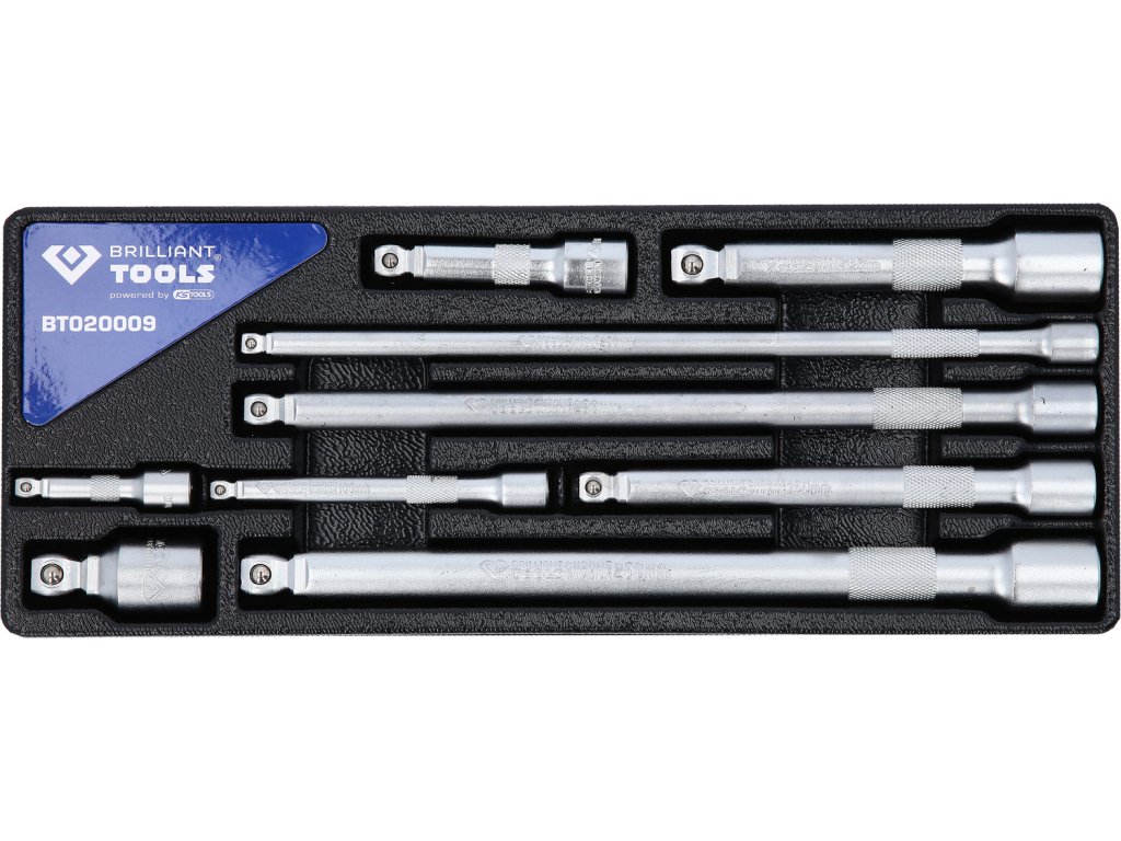 BRILLIANT TOOLS súprava sklápacích predĺžení BT020009 obsahuje 9 rôznych predĺžení v rôznych dĺžkach. Vnútorný štvorhran je vyrobený podľa normy DIN 3120 / ISO 1174 s guľovou záchytnou drážkou. Sklápací uhol je 8°. Flexibilné spojenie je tiež možné kedykoľvek zmeniť na pevné spojenie opätovným stlačením predĺženia a zásuvky. S týmito predĺženiami sa každé pôvodne pevné spojenie s račne a nástrčkového kľúča stane flexibilným spojením, ktoré sa dá ľahko naklápať vo všetkých smeroch. Nedochádza však pritom ku zníženiu prenosu sily. Pracujte ešte flexibilnejšie, rýchlejšie a čistejšie s novými sklápacími predĺženiami.